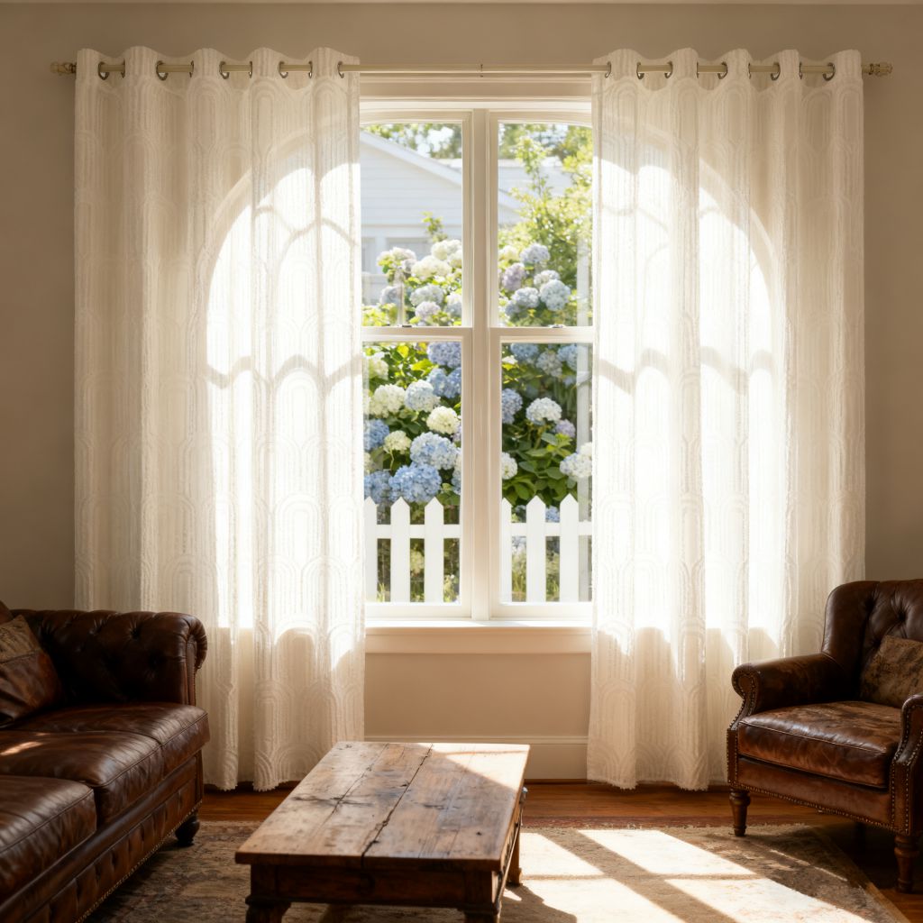 Ruffled sheer curtain (light-filtering & privacy-protective) – brushed fabric with printed plaid pattern, perfect for living rooms, balconies, and small windows